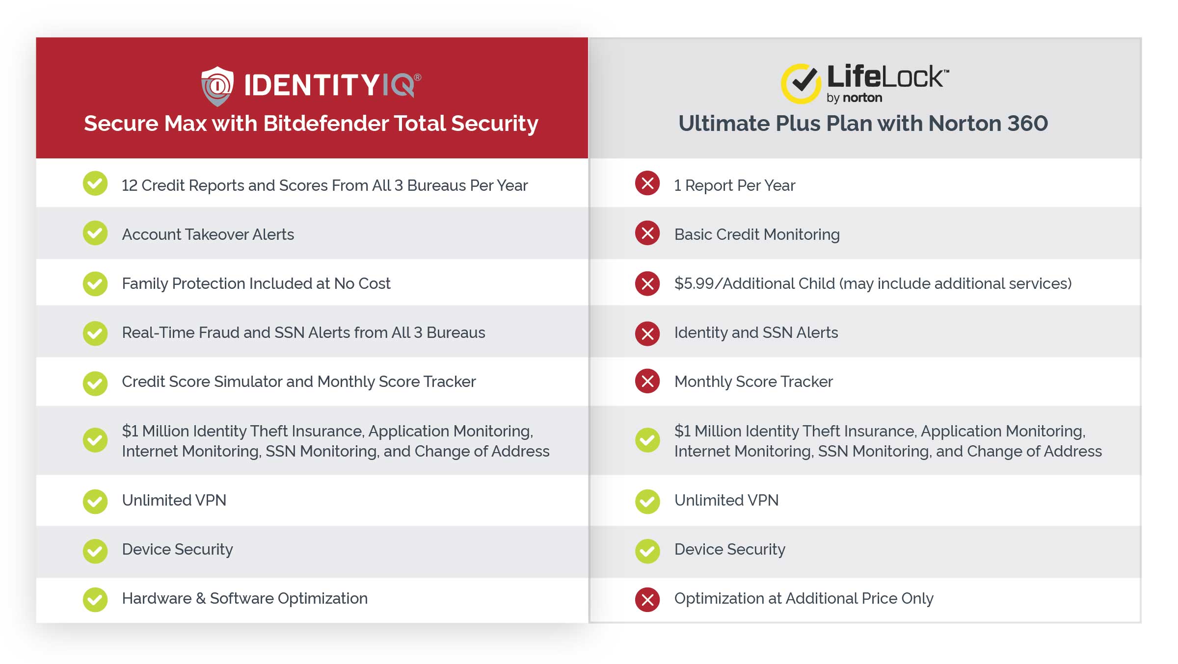 All trademarks and tradenames used in price comparisons are acknowledged to be the copyright of their respective owners. IdentityIQ services are not affiliated with the Symantec corporation or any of its brands, including LifeLock. Price comparison and features for LifeLock are shown on this site as presented at www.lifelock.com and may change.